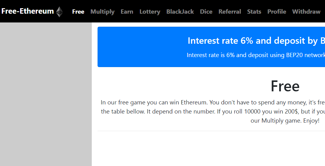 Mục đích: Trang web này cung cấp Ethereum miễn phí cho người dùng thông qua các hoạt động như quay số (roll), giải captcha, xem quảng cáo, hoặc tham gia chương trình giới thiệu.